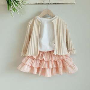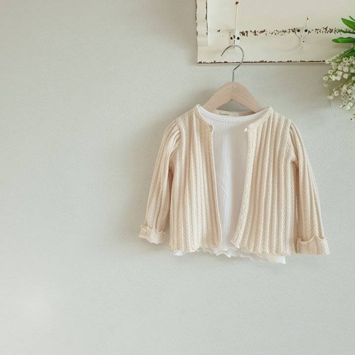 Designul este pus în evidență de croiala lejeră cu guler rotund și umeri ușor încrețiți, ce aduc un volum jucăuș mânecilor. Detaliile atent lucrate, precum manșetele ondulate și închiderea discretă cu un singur nasture perlat, transformă acest cardigan într-o piesă atemporală, potrivită atât pentru momente de joacă, cât și pentru evenimente speciale.