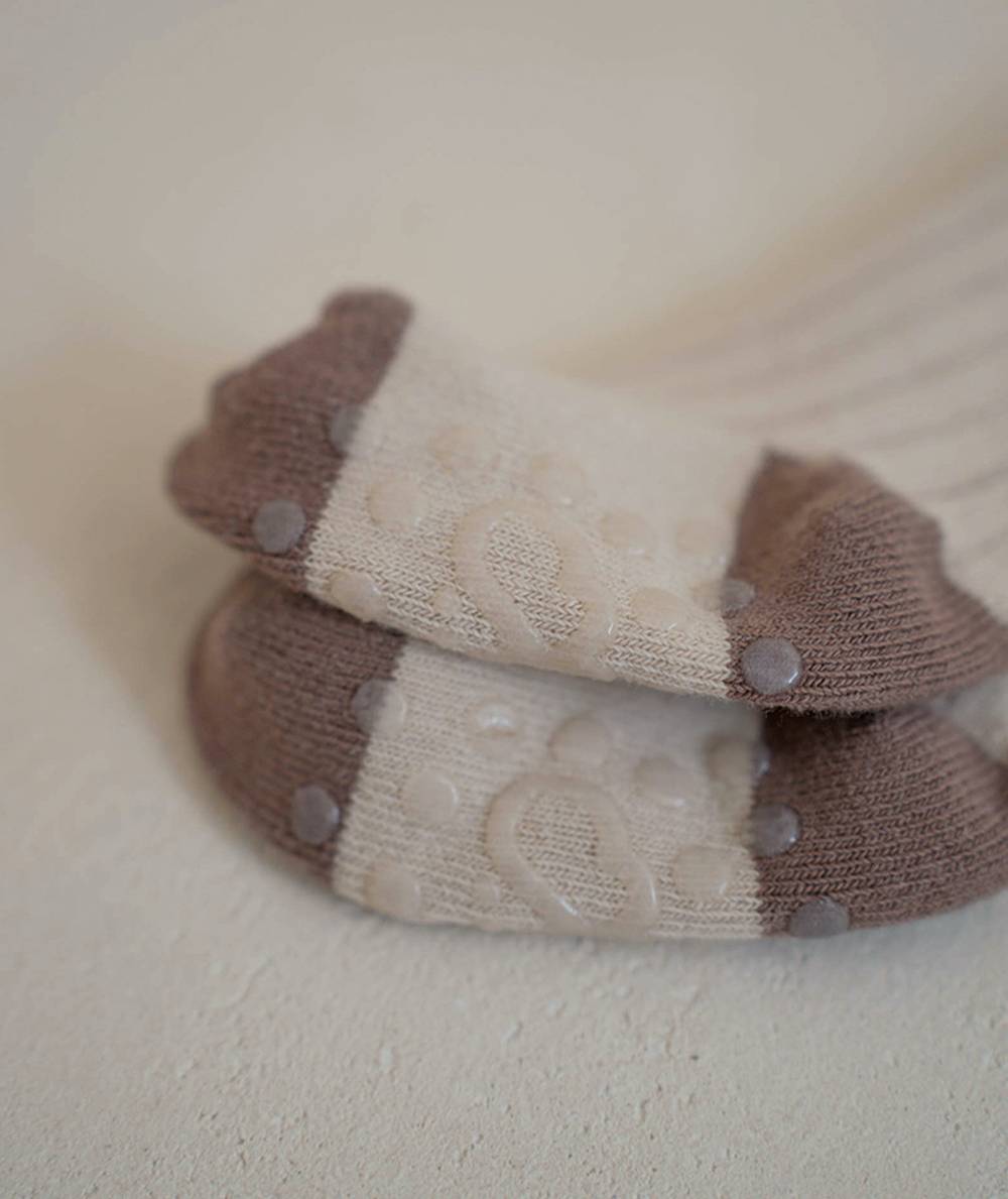 Setul de șosete conține două perechi, realizate din material moale și elastic, delicat cu pielea sensibilă. Șosetele au talpă antiderapantă, oferind stabilitate și siguranță în timpul mersului sau jocului. Designul simplu, în nuanțe naturale, le face ușor de asortat cu diverse ținute.Sunt confortabile, plăcute la purtare și ideale atât pentru interior, cât și pentru primii pași, fiind un accesoriu practic și drăgălaș pentru orice garderobă de copil.